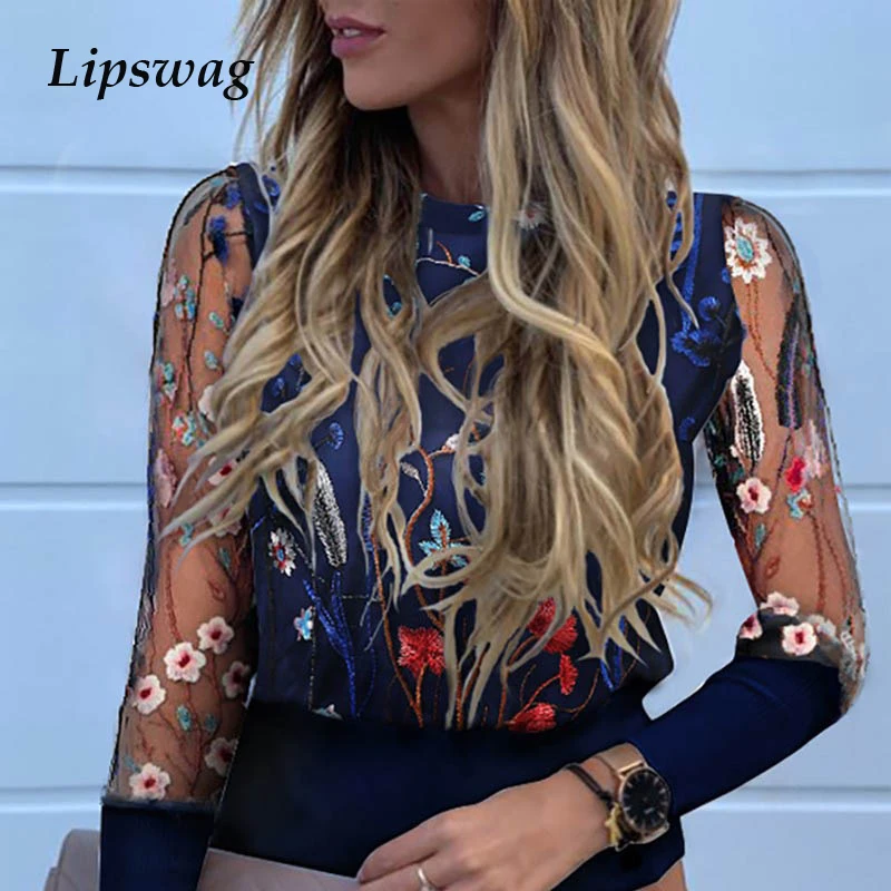 Best Sexy Hollow Out Patchwork Mesh Shirt Blouse Women Fashion See-Through Puff Long Sleeve Top Floral P