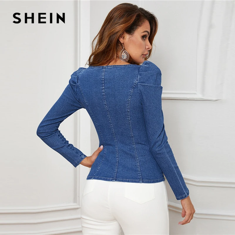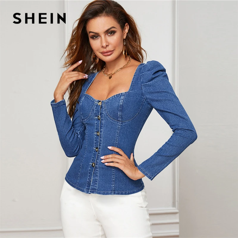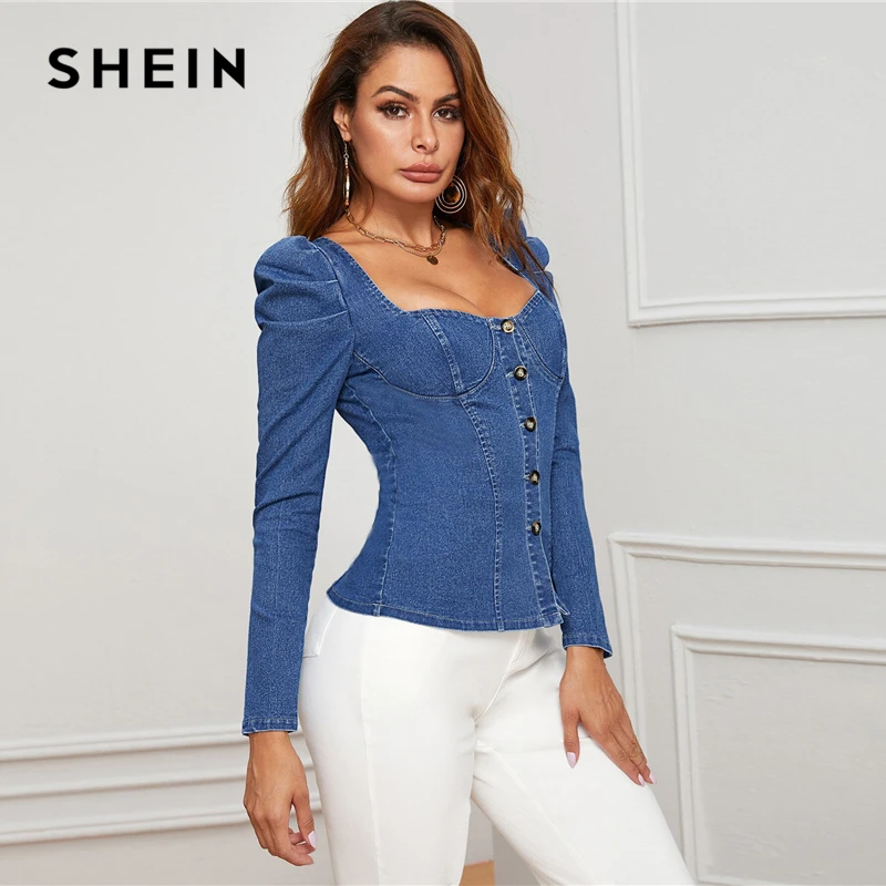 Today i want to review about SHEIN Blue Button Up Puff Sleeve Bustier Denim Top Shirt Women Autumn Sweetheart Neck Slim Fitted S. I uncover this cool product from China Online Store, best manucafturer.