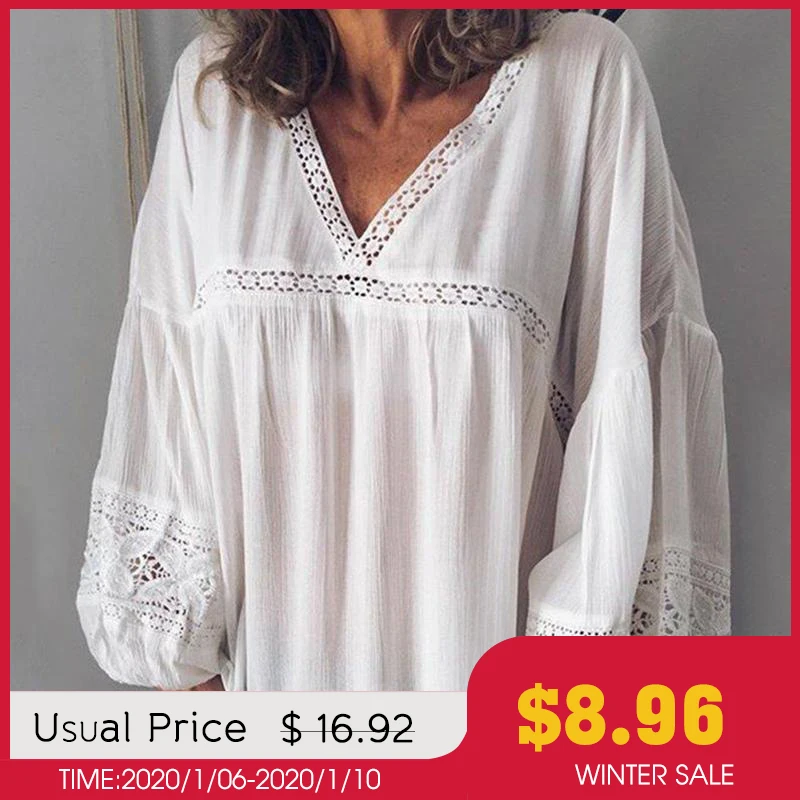 Promo 2019 ZANZEA Elegant Lace Patchwork Blouse Women Tunic Sexy V Neck Puff Sleeve Blusas Mujer Female A