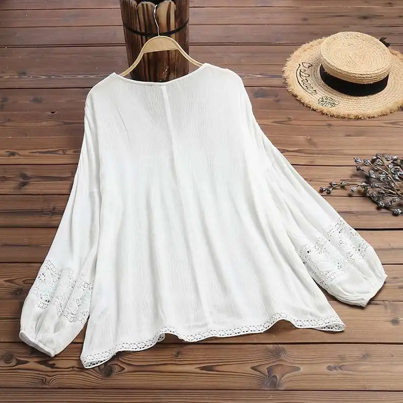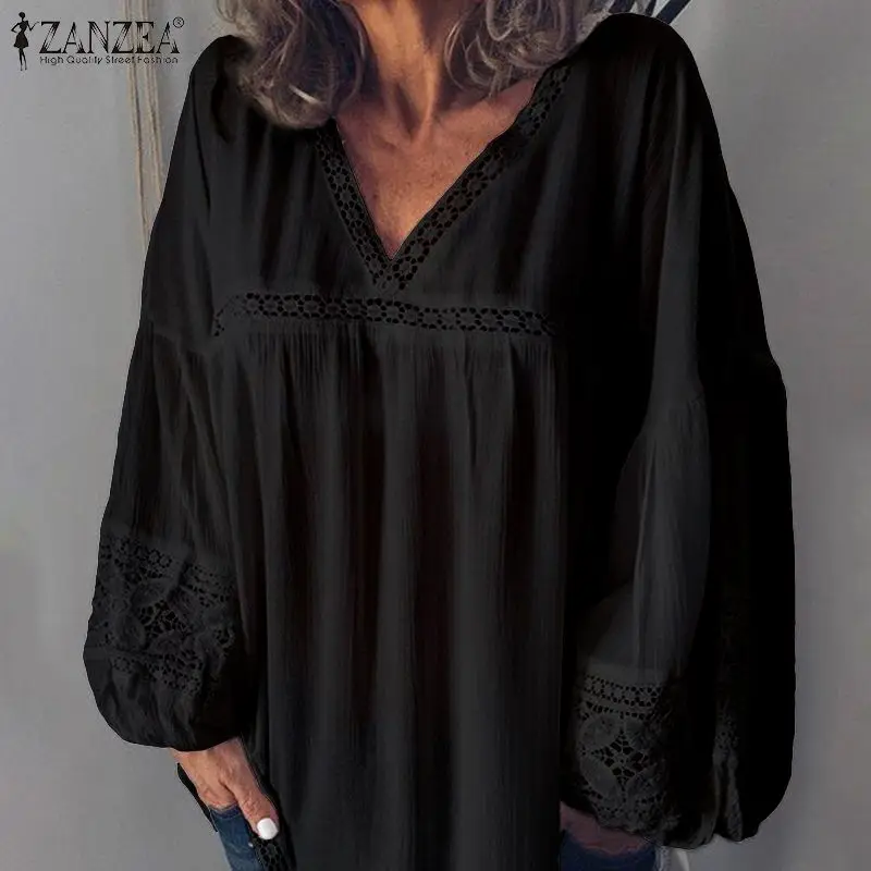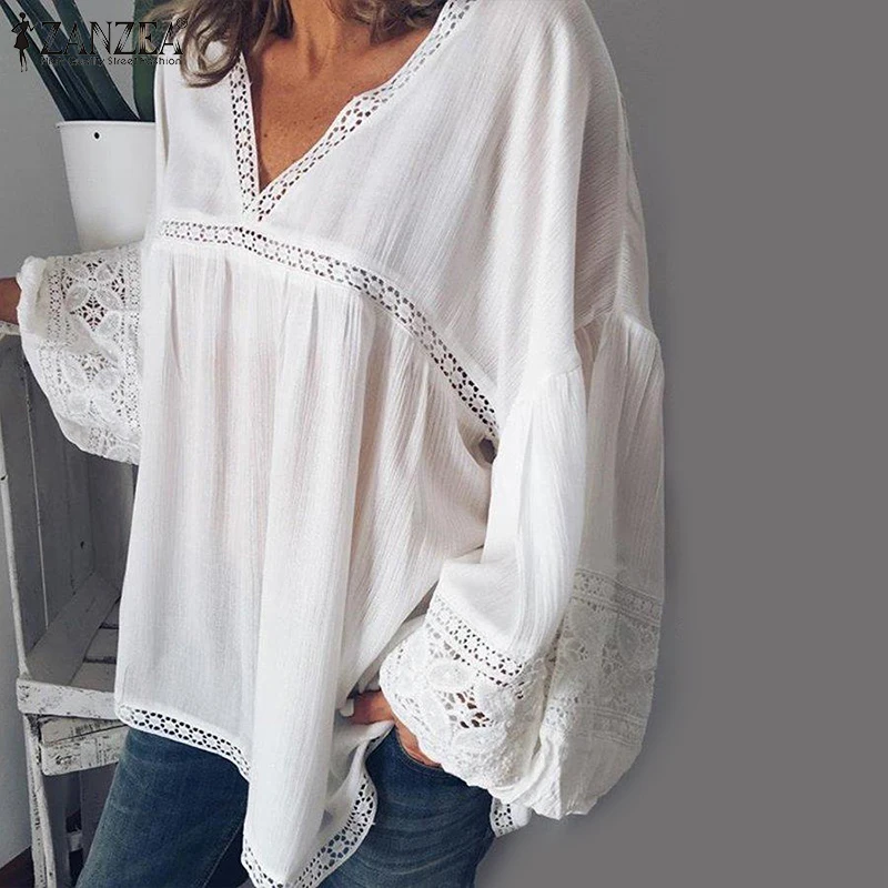 New 2019 ZANZEA Elegant Lace Patchwork Blouse Women Tunic Sexy V Neck Puff Sleeve Blusas Mujer Female A