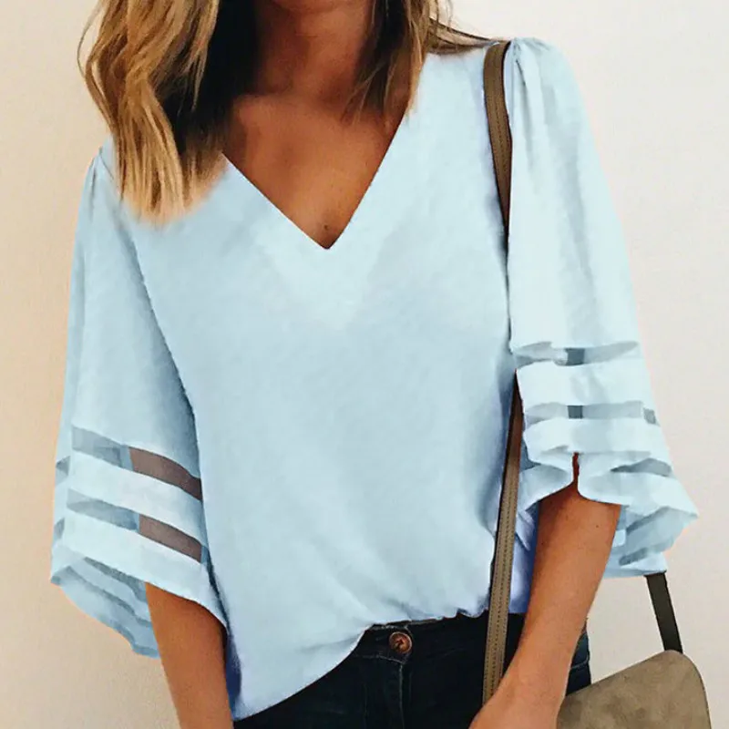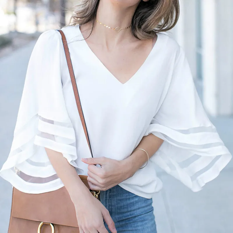 New V Neck Flared Sleeves Mesh Patchwork Shirts Summer Plus Size Casual Loose Mesh Women Blouse Pink St