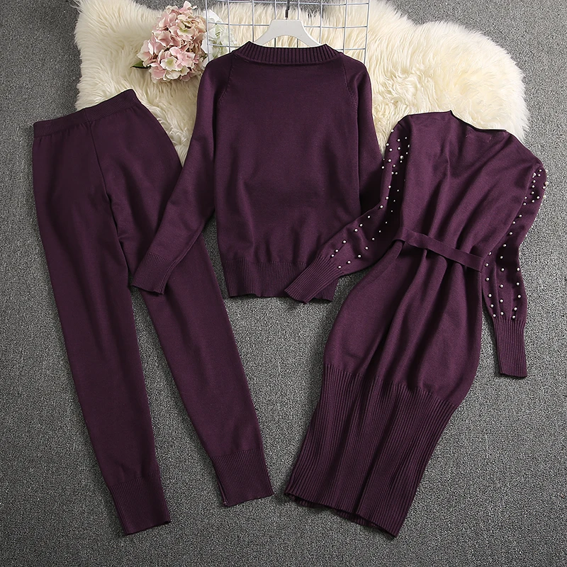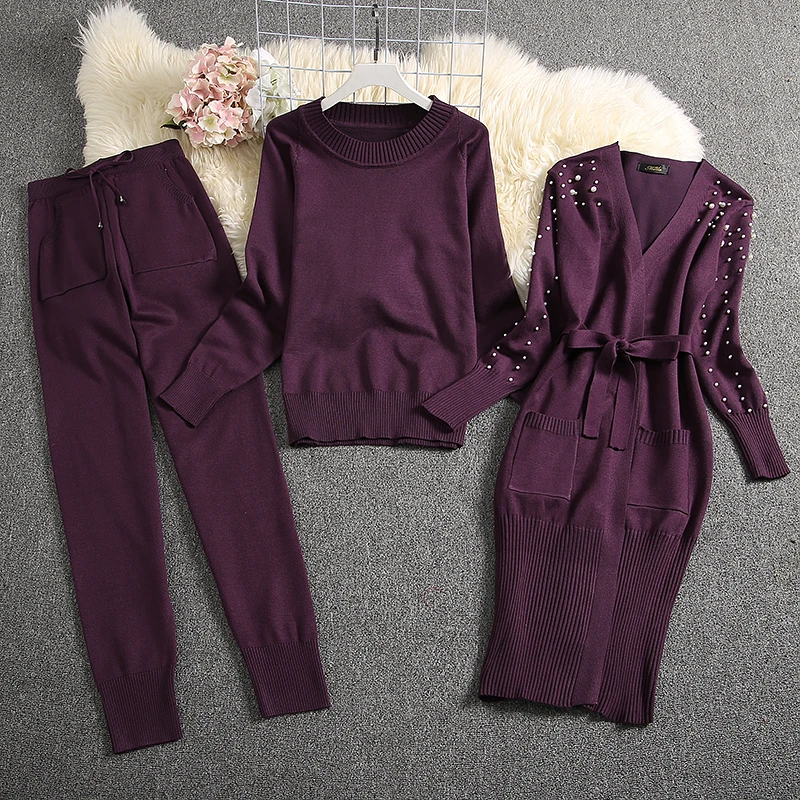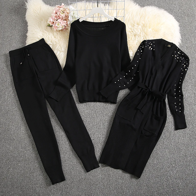Buy ALPHALMODA 2019 Winter Women Warm 3pcs Knitting Suits Long-sleeved Pearl Cardigans + Sweater + Trou
