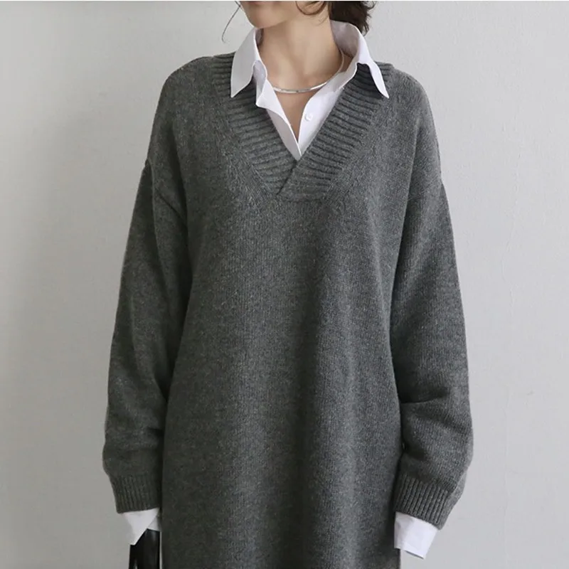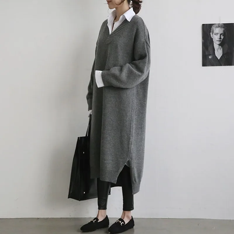 New Korean Fashion Sweater Dress Women 2019 Autumn Winter Low High Design Side Slit Thick V Neck Knitte