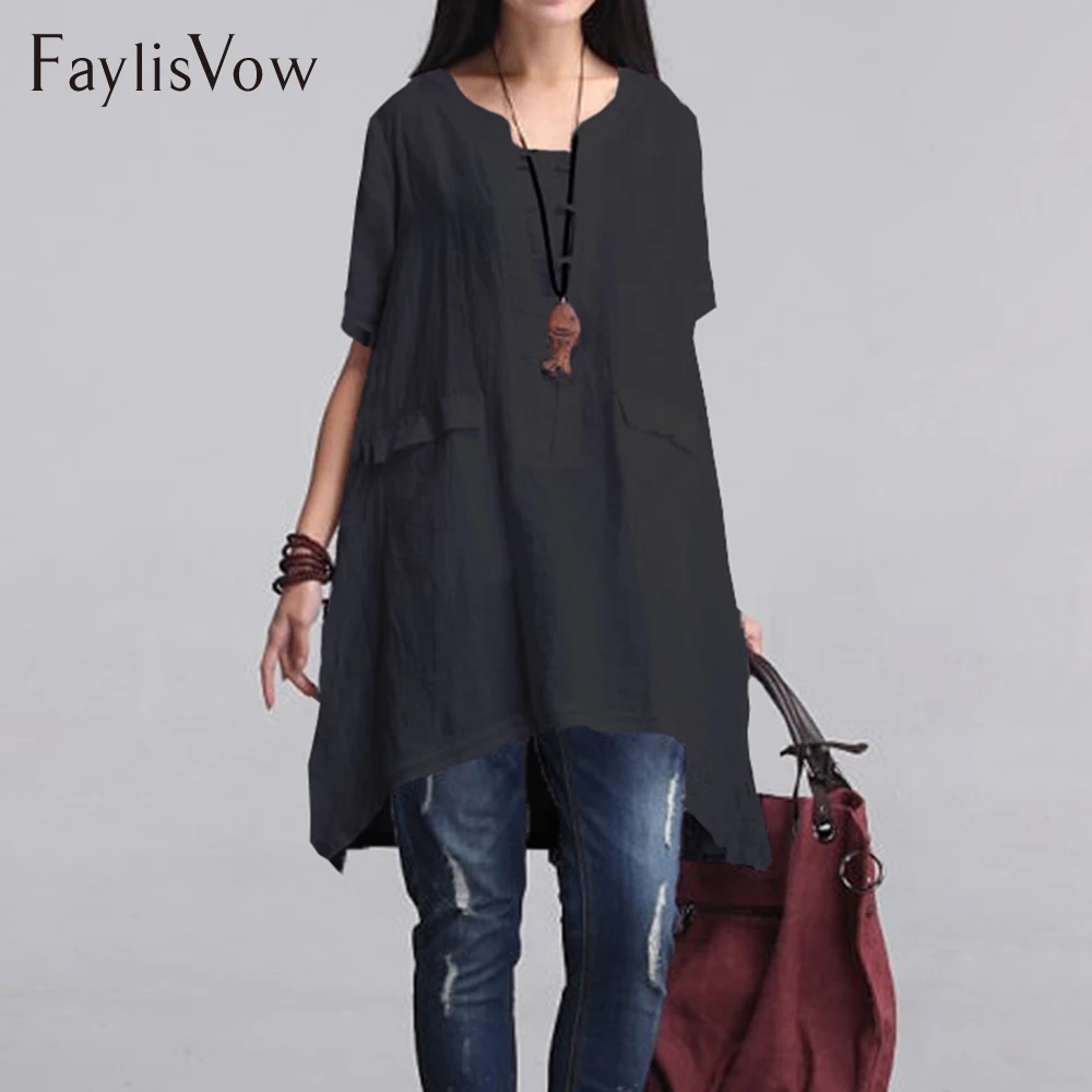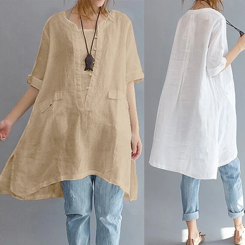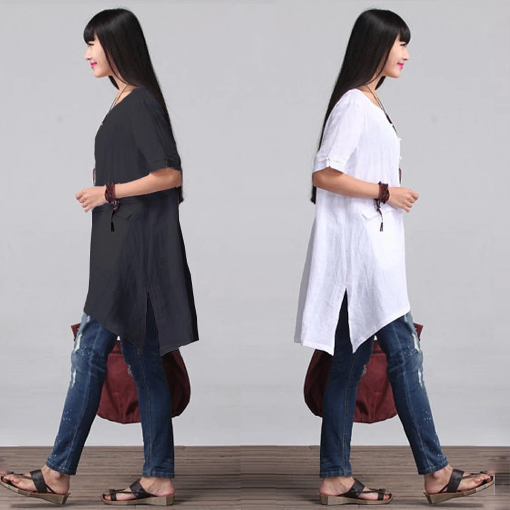Best Vintage Round Neck Cotton Linen Blouse Women Plus Size Loose Short Sleeve Long Blouses Top Female I