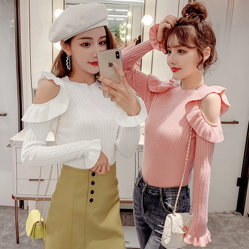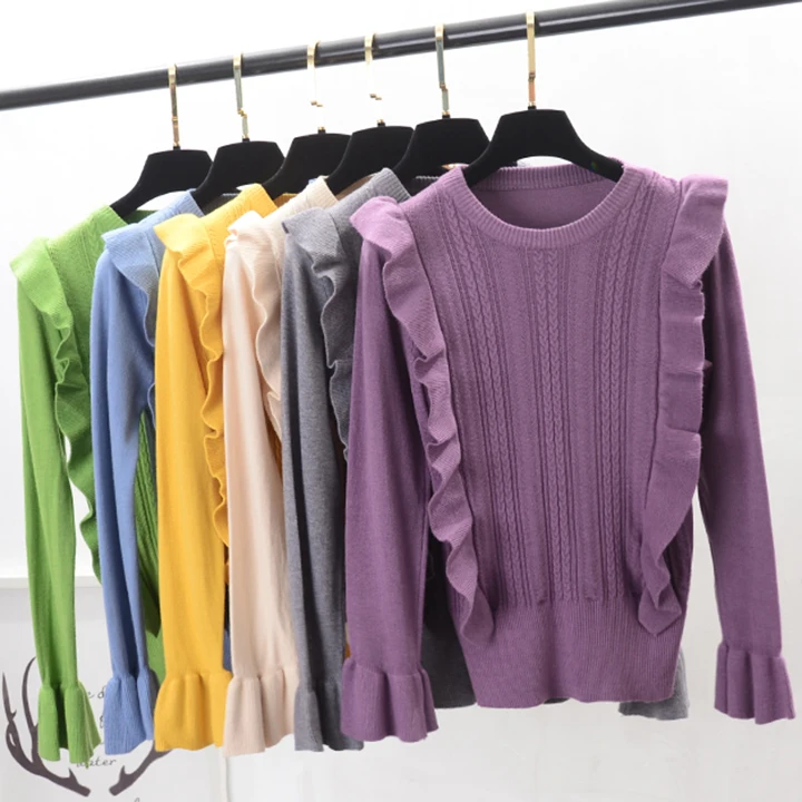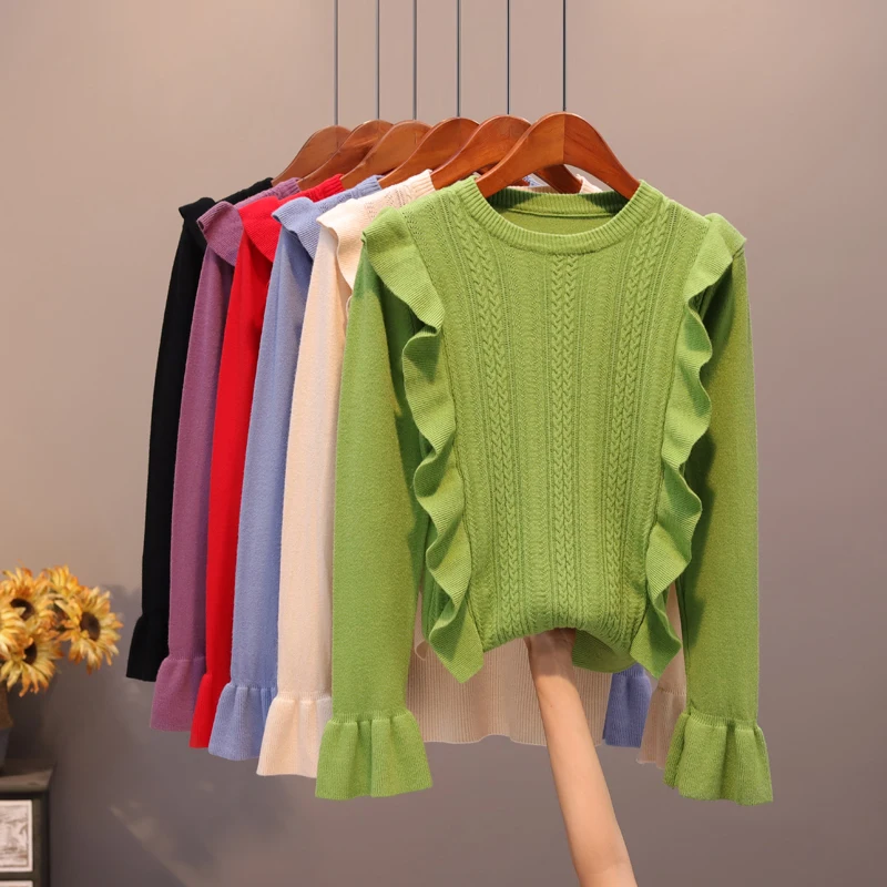 Buy 2019 Autumn Ruffles Sweater Women Sweet Flare Sleeve Slim winter sweater pullover O neck casual fem