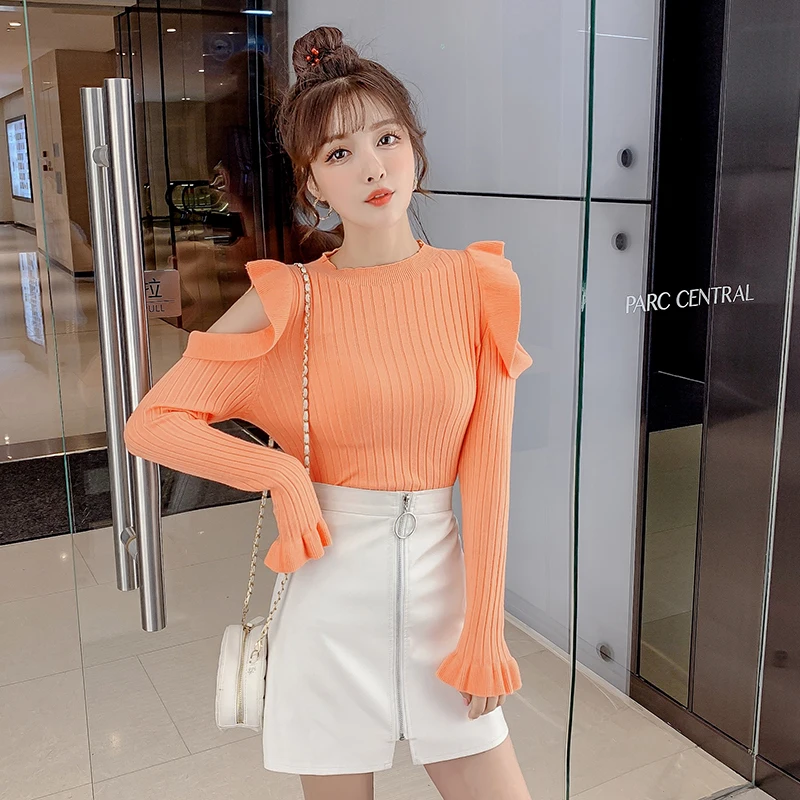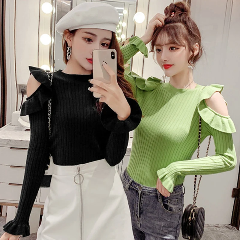Best 2019 Autumn Ruffles Sweater Women Sweet Flare Sleeve Slim winter sweater pullover O neck casual fem