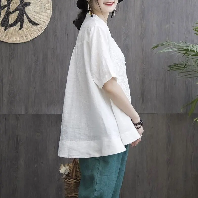 New F&je New Summer Style Women Shirt Plus Size Short Sleeve Loose Embroidery Cotton Linen Blouse Big L