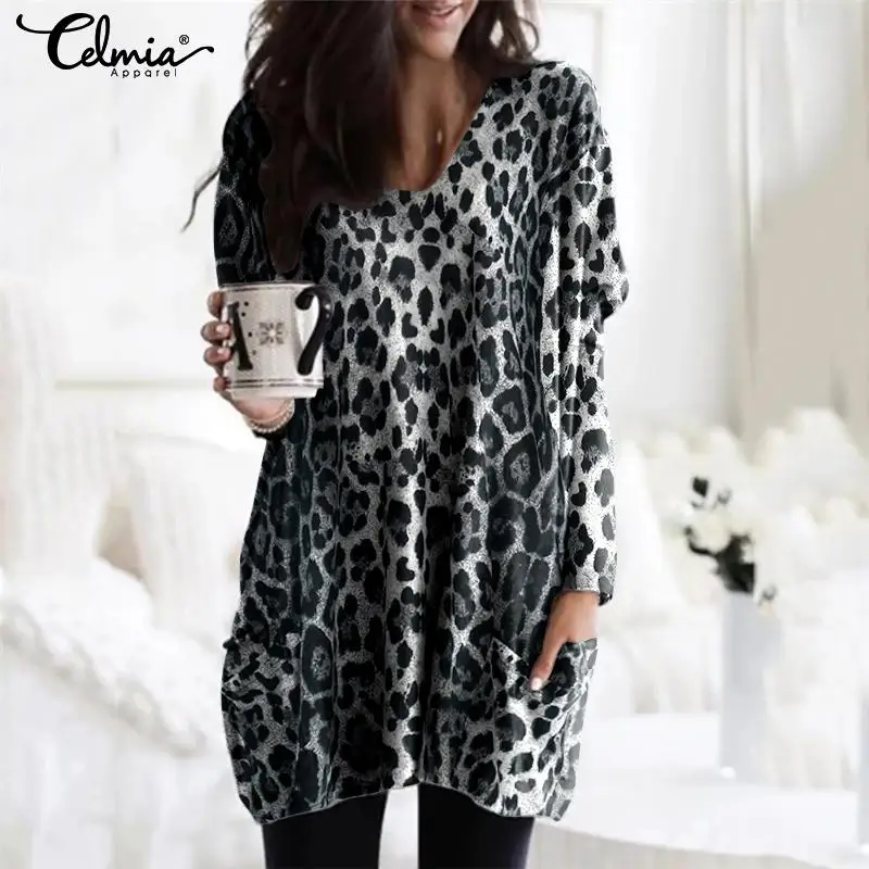 Promo Celmia Plus Size Vintage Long Sleeve Tunic Tops Women Sexy V-Neck Pockets Blouses Casual Leopard Pr